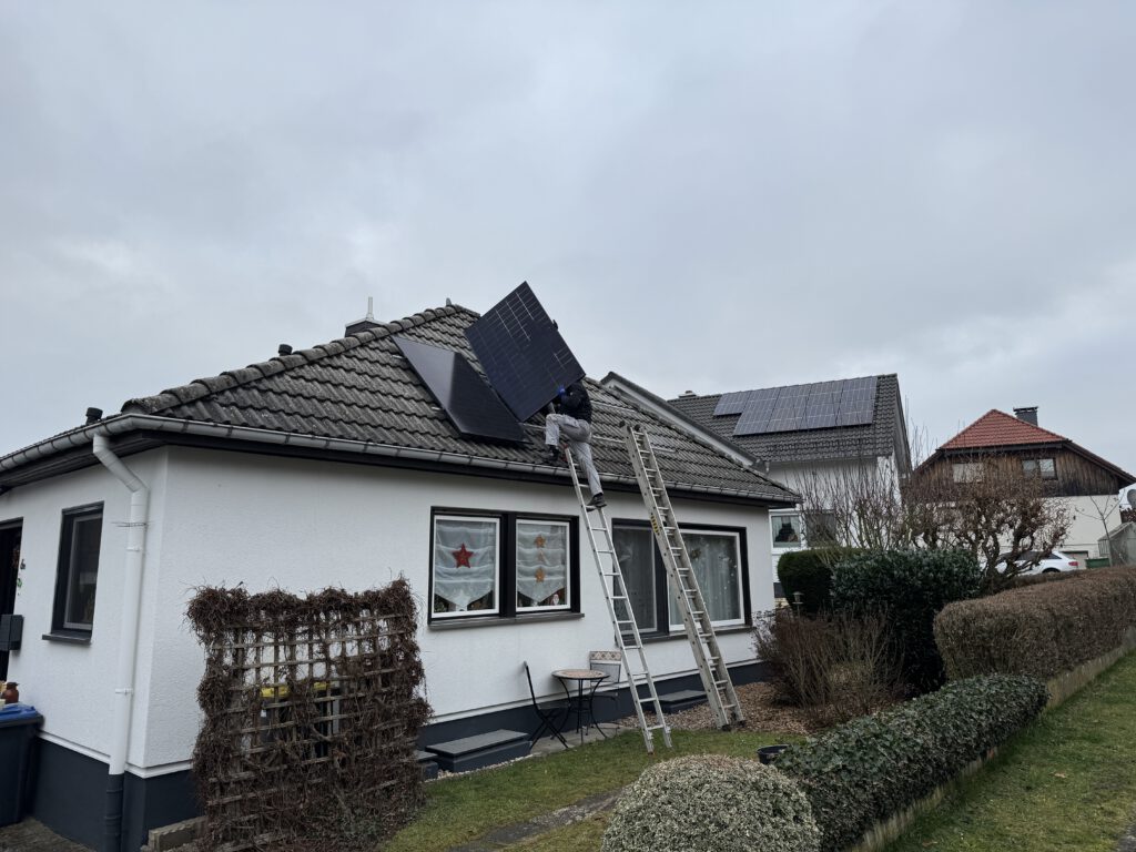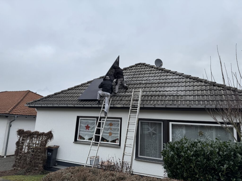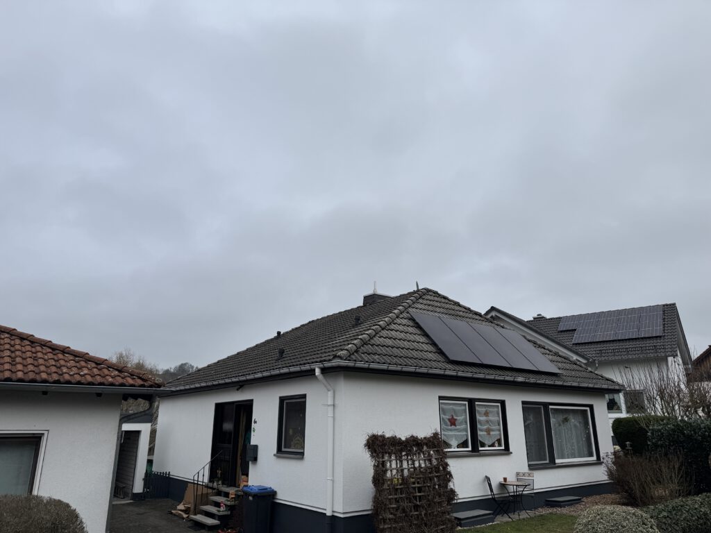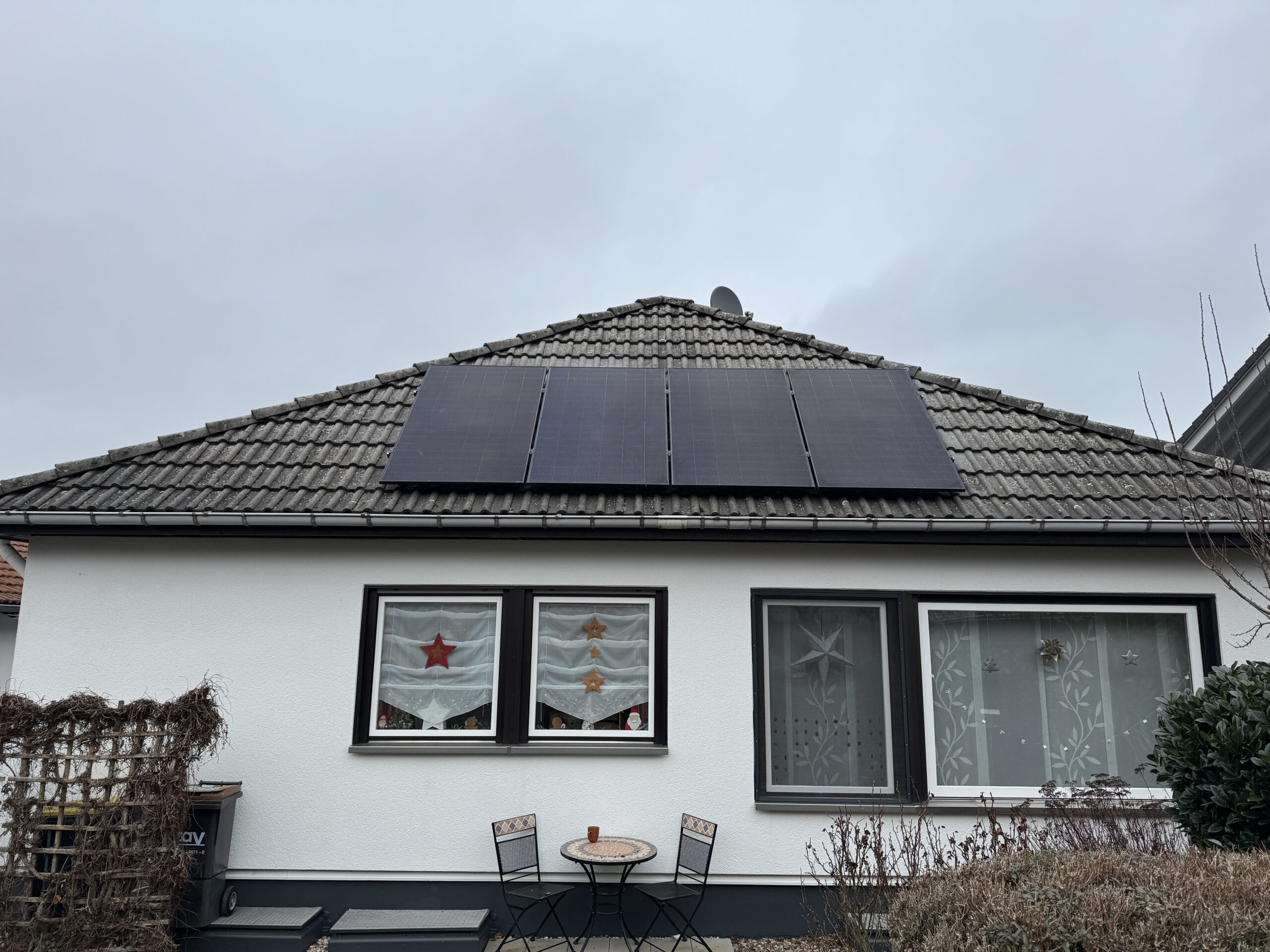 Wir haben ein Balkonkraftwerk mit vier 500-Watt-Modulen und einem Speicher an auf einem Walmdach eines Bungalows montiert. Eingesetzt wurde dieses Mal kein Speichersystem sondern ein 1600W Wechselrichter von Hoymiles, der auf 800W gedrosselt wurde.
